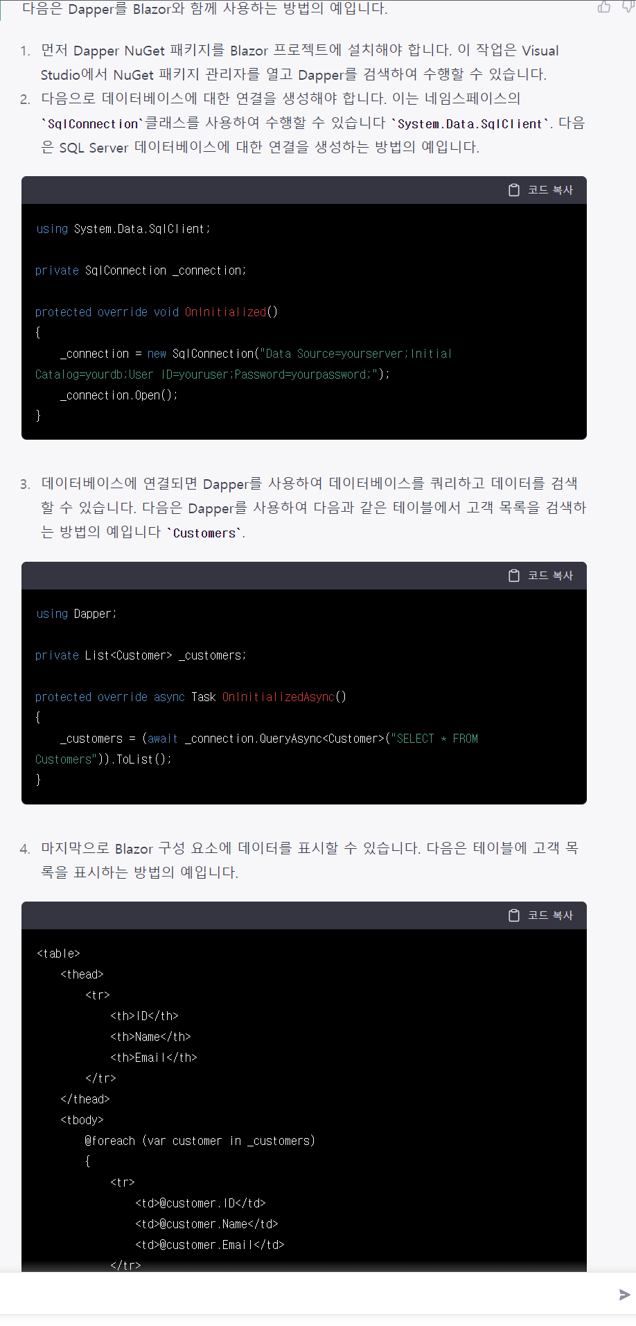 얼마나 똑똑한가 요즘 개발하고 있는 blazor 관련 몇 가지 명령(요청? or 대화?)을 내려봤다. 가상의 AI와 대화한다는 것 자체가 아직까지 영화같은 느낌으로 다가온다. 일단 그저 신기할 따름이다.